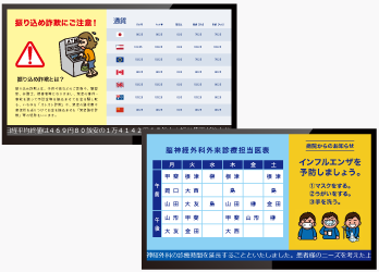 振り込み詐欺やインフルエンザ予防など、その時々で注意を喚起してほしい情報を発信するのに効果的です。分かりやすい案内表示をすることで、人の流れが円滑になります。また、取扱い商品の紹介や、病気の正しい知識を提供することにより、お客様に待ち時間を有意義に過ごしていただけます。